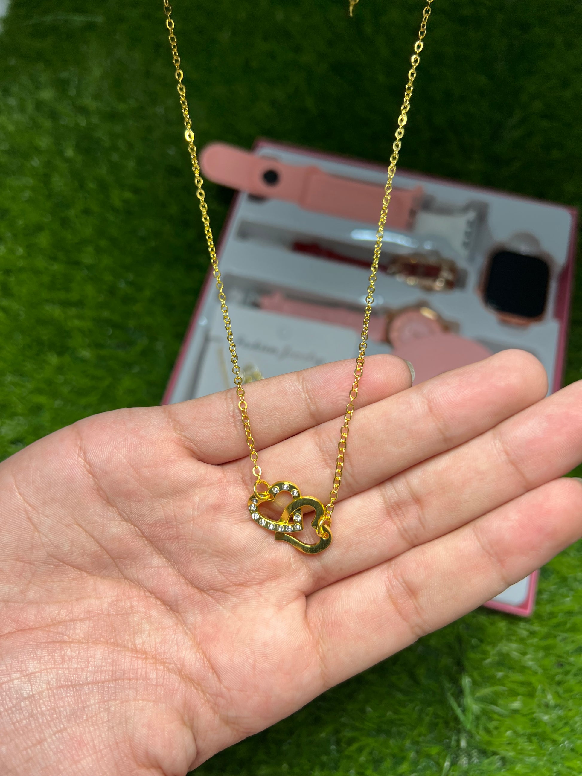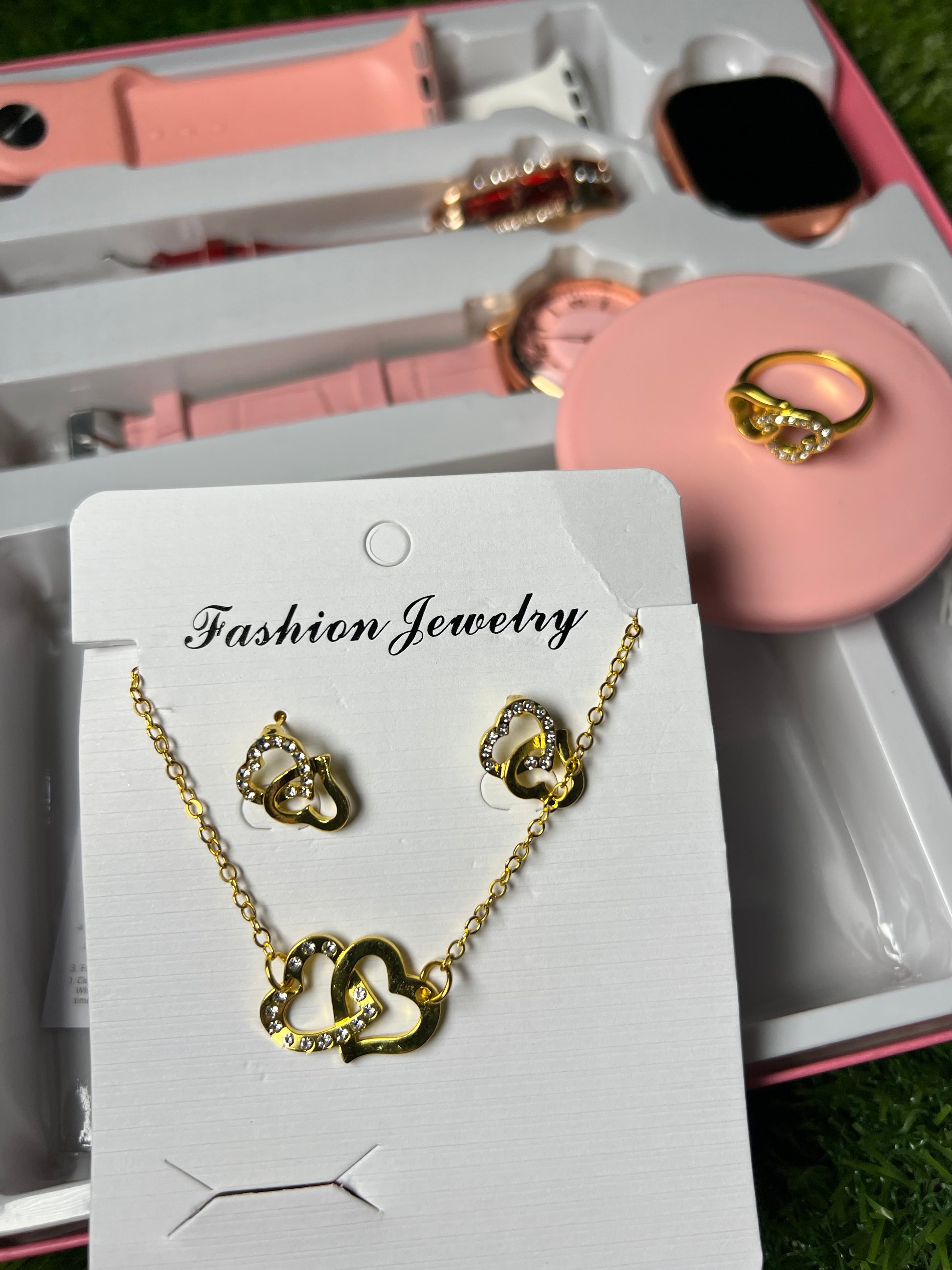 The Ladies 10 in 1 Watch offers versatility with multiple styles, including a pink and white two-step watch, a red watch with a gold dial, and a pink watch with an intricate design. Accompanied by complementary rings, a necklace, and a bracelet, this set caters to various fashion preferences, enhancing personal style efficiently.